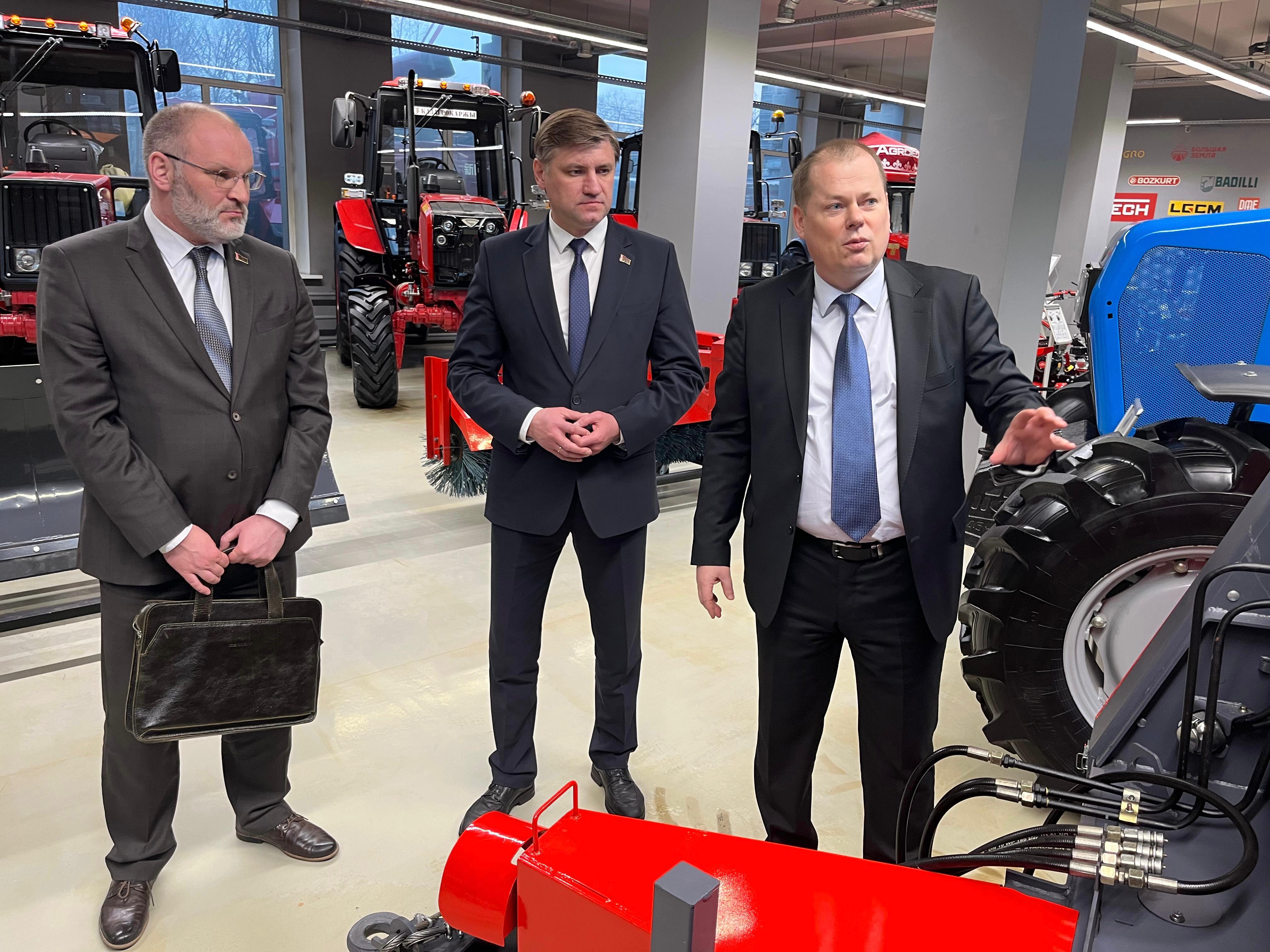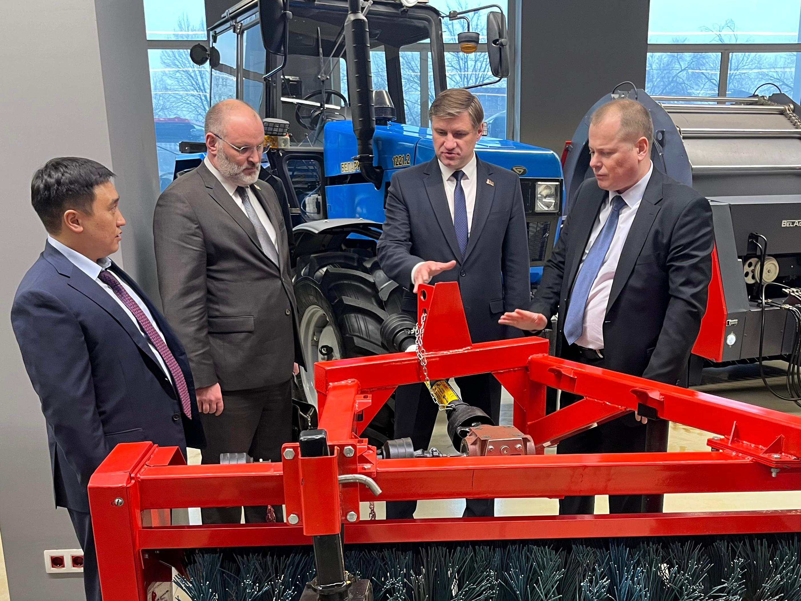 А.Богданов ознакомился с первыми партиями произведенного оборудования, в создании которого используются белорусские комплектующие. Данное агрегаты (отвалы, щетки, плуги и пр.) будут устанавливаться на белорусских тракторах МТЗ, производимых на сборочных производствах в Казахстане.